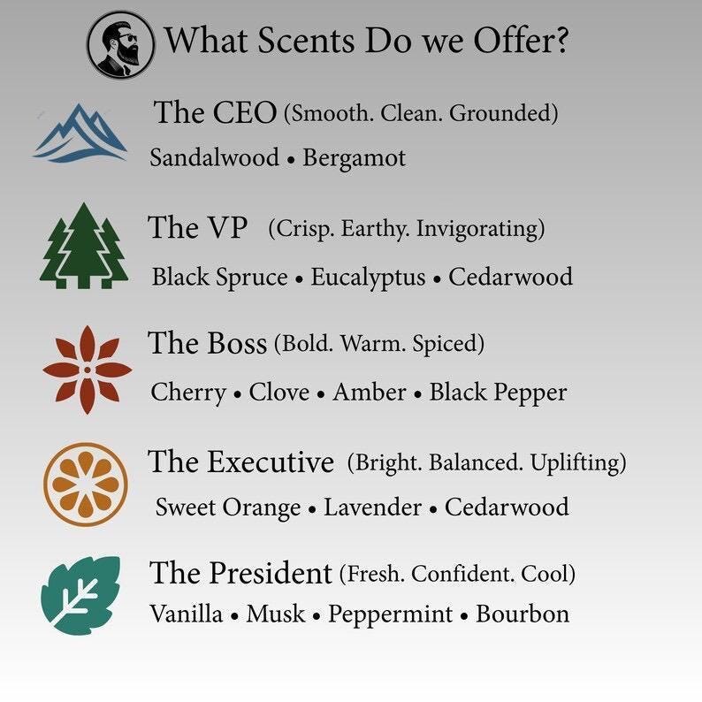 Whether you‘re stepping into the boardroom or out for the evening, The President offers the ultimate in beard grooming excellence with a fresh peppermint burst layered over warm vanilla, musk, and smooth bourbon notes.